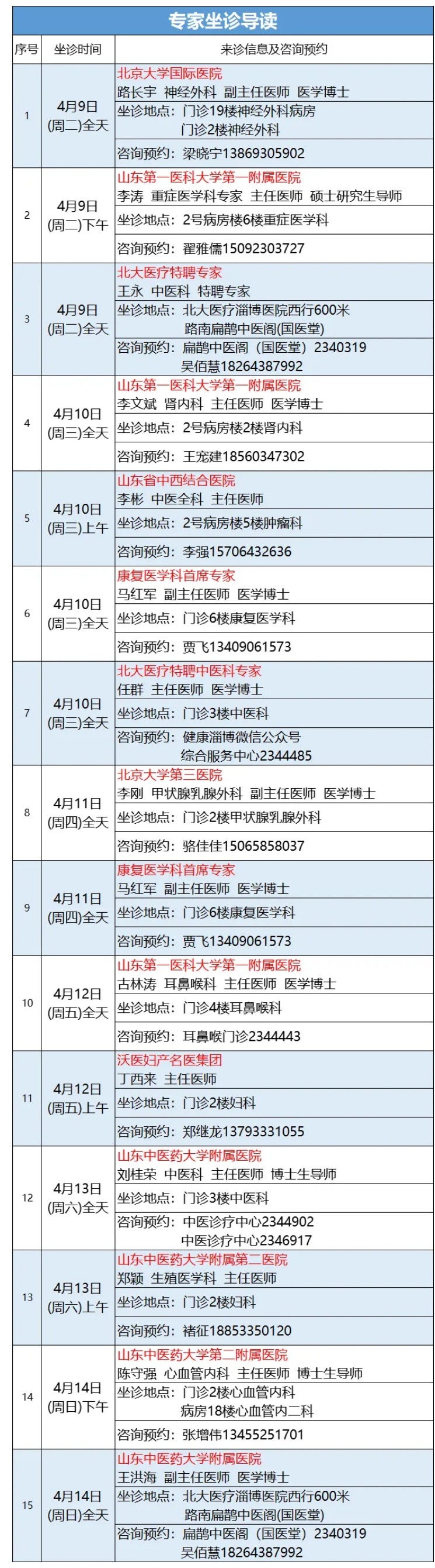 4月8日——4月14日(周一至周日)北京大學國際醫(yī)院神經(jīng)外科副主任醫(yī)師路長宇,山東第一醫(yī)科大學第一附屬醫(yī)院重癥醫(yī)學科主任醫(yī)師李濤,山東中醫(yī)藥大學第二附屬醫(yī)院心血管內(nèi)科主任醫(yī)師陳守強,山東中醫(yī)藥大學附屬醫(yī)院主任醫(yī)師劉桂榮等14位名醫(yī)將來北大醫(yī)療淄博醫(yī)院(淄博經(jīng)開區(qū)醫(yī)院)坐診。廣大市民如有就診需求,可以通過電話、現(xiàn)場咨詢等方式提前預約。