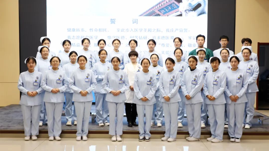 培訓結(jié)束后,伴隨著悠揚的樂曲,兩名護理前輩(護理部副主任何林林左一、普外科護士長崔麗麗右)為新入院護士戴上了圣潔的燕尾帽。