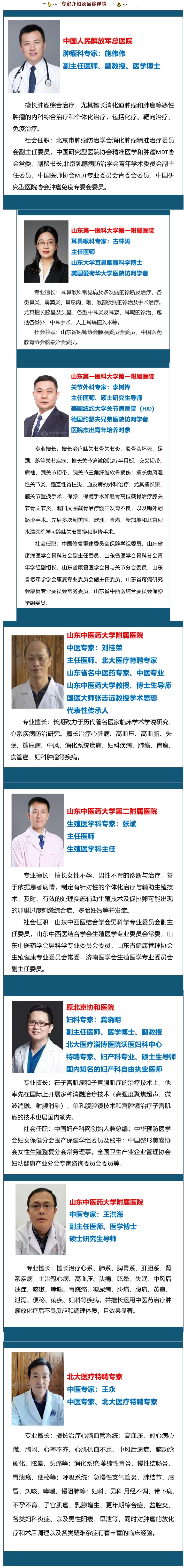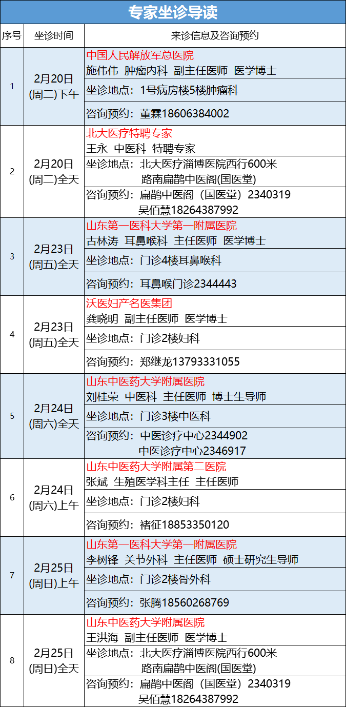 2月19日——2月25日(周一至周日)中國(guó)人民解放軍總醫(yī)院腫瘤內(nèi)科副主任醫(yī)師施偉偉,山東第一醫(yī)科大學(xué)第一附屬醫(yī)院耳鼻喉科主任醫(yī)師古林濤,山東中醫(yī)藥大學(xué)第二附屬醫(yī)院生殖醫(yī)學(xué)科主任醫(yī)師張斌,山東中醫(yī)藥大學(xué)附屬醫(yī)院主任醫(yī)師劉桂榮等8位名醫(yī)將來北大醫(yī)療淄博醫(yī)院(淄博經(jīng)開區(qū)醫(yī)院)坐診。廣大市民如有就診需求,可以通過電話、現(xiàn)場(chǎng)咨詢等方式提前預(yù)約。